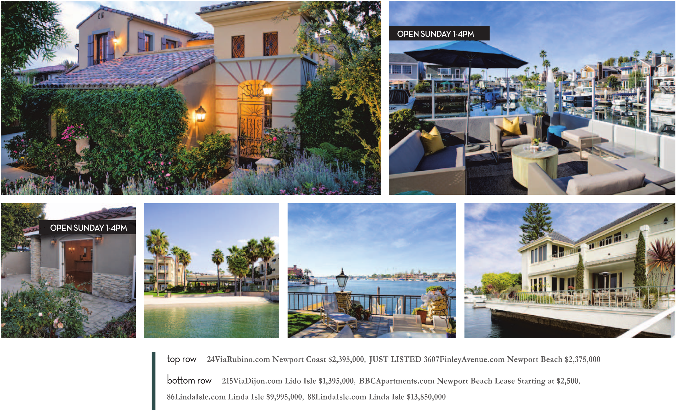 OPEN SUNDAY 1-4PM OPEN SUNDAY 1-4PM top row 24ViaRubino.com Newport Coast $2,395,000, JUST LISTED 3607FinleyAvenue.com Newport Beach $2,375,000 bottom row 215ViaDijon.com Lido Isle $1,395,000, BBCApartments.com Newport Beach Lease Starting at $2,500, 86LindaIsle.com Linda Isle $9,995,000, 88LindaIsle.com Linda Isle $13,850,000