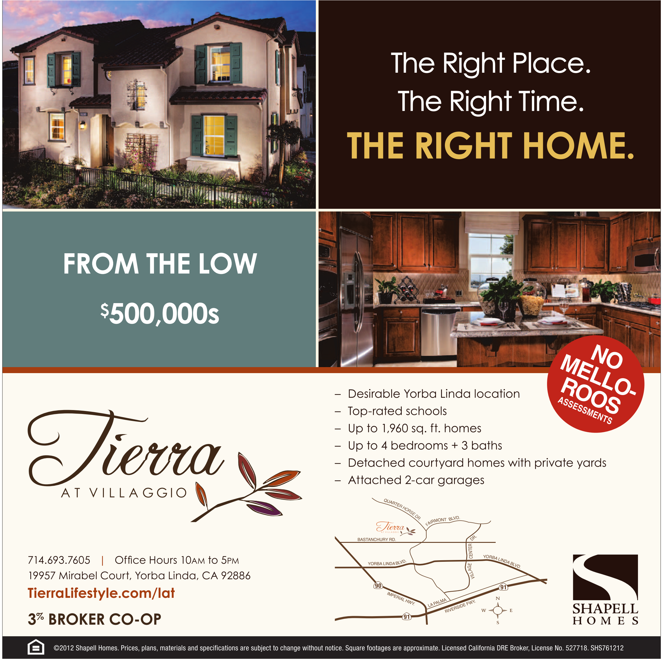The Right Place. The Right Time. THE RIGHT HOME. FROM THE LOW $ 500,000s – Desirable Yorba Linda location – Top-rated schools – Up to 1,960 sq. ft. homes – Up to 4 bedrooms + 3 baths – Detached courtyard homes with private yards – Attached 2-car garages 714.693.7605 | Office Hours 10AM to 5PM 19957 Mirabel Court, Yorba Linda, CA 92886 TierraLifestyle.com/lat 3 % BROKER CO-OP ©2012 Shapell Homes. Prices, plans, materials and specifications are subject to change without notice. Square footages are approximate. Licensed California DRE Broker, License No. 527718. SHS761212