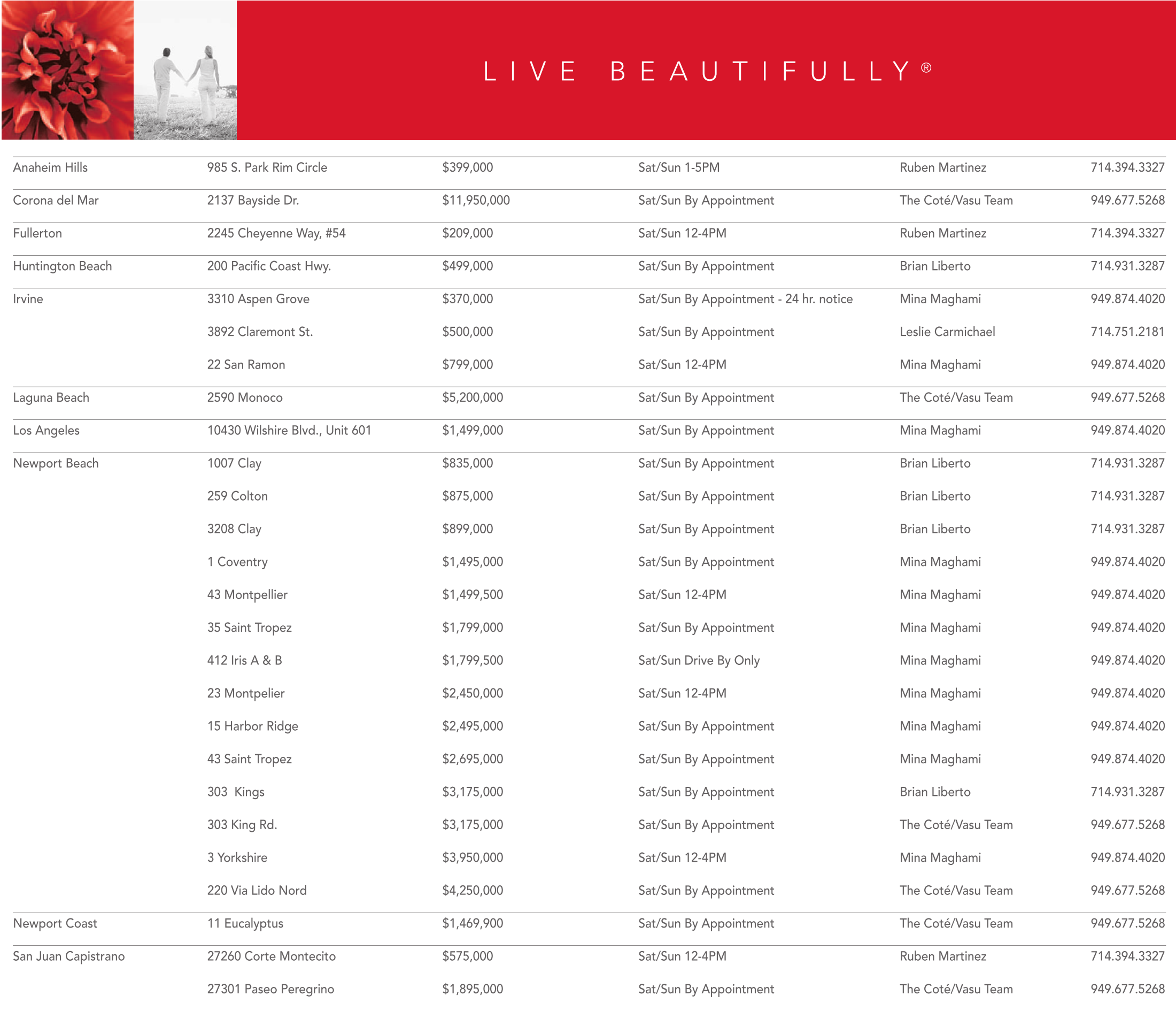 3892 Claremont St. $500,000 Sat/Sun By Appointment Leslie Carmichael 714.751.2181 22 San Ramon $799,000 Sat/Sun 12-4PM Mina Maghami 949.874.4020 Laguna Beach 2590 Monoco $5,200,000 Sat/Sun By Appointment The Coté/Vasu Team 949.677.5268 Los Angeles 10430 Wilshire Blvd., Unit 601 $1,499,000 Sat/Sun By Appointment Mina Maghami 949.874.4020 Newport Beach 1007 Clay $835,000 Sat/Sun By Appointment Brian Liberto 714.931.3287 259 Colton $875,000 Sat/Sun By Appointment Brian Liberto 714.931.3287 3208 Clay $899,000 Sat/Sun By Appointment Brian Liberto 714.931.3287 1 Coventry $1,495,000 Sat/Sun By Appointment Mina Maghami 949.874.4020 43 Montpellier $1,499,500 Sat/Sun 12-4PM Mina Maghami 949.874.4020 35 Saint Tropez $1,799,000 Sat/Sun By Appointment Mina Maghami 949.874.4020 412 Iris A & B $1,799,500 Sat/Sun Drive By Only Mina Maghami 949.874.4020 23 Montpelier $2,450,000 Sat/Sun 12-4PM Mina Maghami 949.874.4020 15 Harbor Ridge $2,495,000 Sat/Sun By Appointment Mina Maghami 949.874.4020 43 Saint Tropez $2,695,000 Sat/Sun By Appointment Mina Maghami 949.874.4020 303 Kings $3,175,000 Sat/Sun By Appointment Brian Liberto 714.931.3287 303 King Rd. $3,175,000 Sat/Sun By Appointment The Coté/Vasu Team 949.677.5268 3 Yorkshire $3,950,000 Sat/Sun 12-4PM Mina Maghami 949.874.4020 220 Via Lido Nord $4,250,000 Sat/Sun By Appointment The Coté/Vasu Team 949.677.5268 Newport Coast 11 Eucalyptus $1,469,900 Sat/Sun By Appointment The Coté/Vasu Team 949.677.5268 San Juan Capistrano 27260 Corte Montecito $575,000 Sat/Sun 12-4PM Ruben Martinez 714.394.3327 27301 Paseo Peregrino $1,895,000 Sat/Sun By Appointment The Coté/Vasu Team 949.677.5268