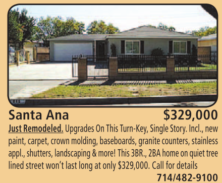 Santa Ana $329,000 Just Remodeled. Upgrades On This Turn-Key, Single Story. Incl., new paint, carpet, crown molding, baseboards, granite counters, stainless appl., shutters, landscaping & more! This 3BR., 2BA home on quiet tree lined street won’t last long at only $329,000. Call for details 714/482-9100