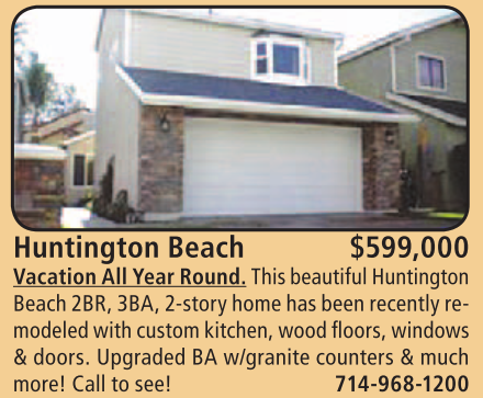 Huntington Beach $599,000 Vacation All Year Round. This beautiful Huntington Beach 2BR, 3BA, 2-story home has been recently remodeled with custom kitchen, wood floors, windows & doors. Upgraded BA w/granite counters & much more! Call to see! 714-968-1200
