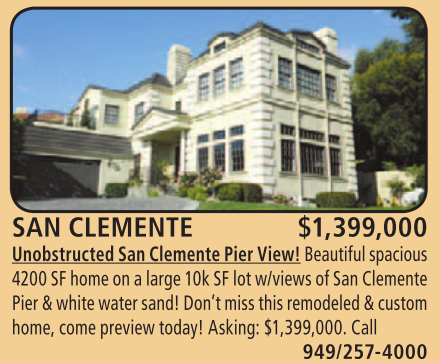 SAN CLEMENTE $1,399,000 Unobstructed San Clemente Pier View! Beautiful spacious 4200 SF home on a large 10k SF lot w/views of San Clemente Pier & white water sand! Don’t miss this remodeled & custom home, come preview today! Asking: $1,399,000. Call 949/257-4000