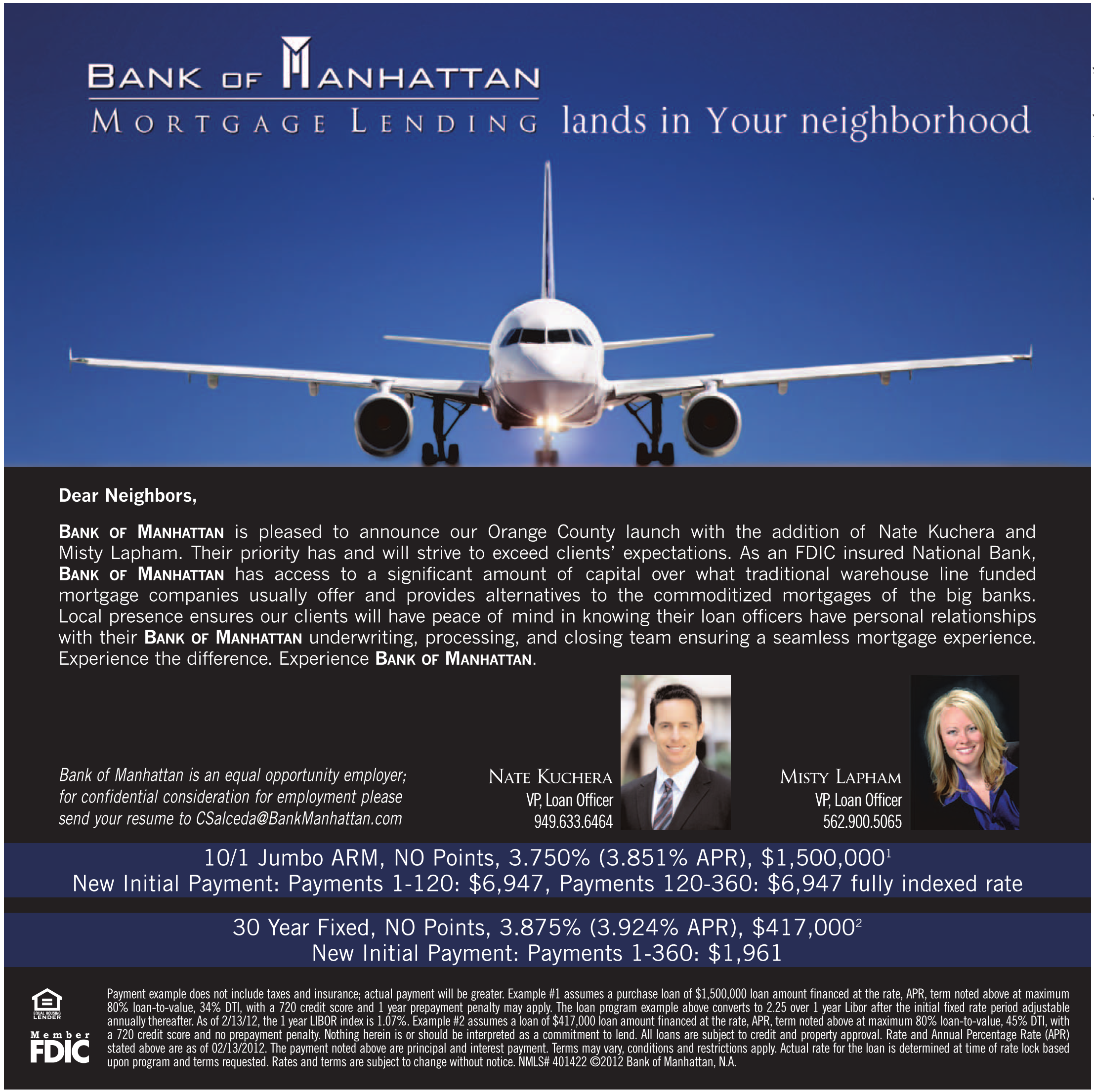 BANK OF MANHATTAN is pleased to announce our Orange County launch with the addition of Nate Kuchera and Misty Lapham. Their priority has and will strive to exceed clients’ expectations. As an FDIC insured National Bank, BANK OF MANHATTAN has access to a significant amount of capital over what traditional warehouse line funded mortgage companies usually offer and provides alternatives to the commoditized mortgages of the big banks. Local presence ensures our clients will have peace of mind in knowing their loan officers have personal relationships with their BANK OF MANHATTAN underwriting, processing, and closing team ensuring a seamless mortgage experience. Experience the difference. Experience BANK OF MANHATTAN.