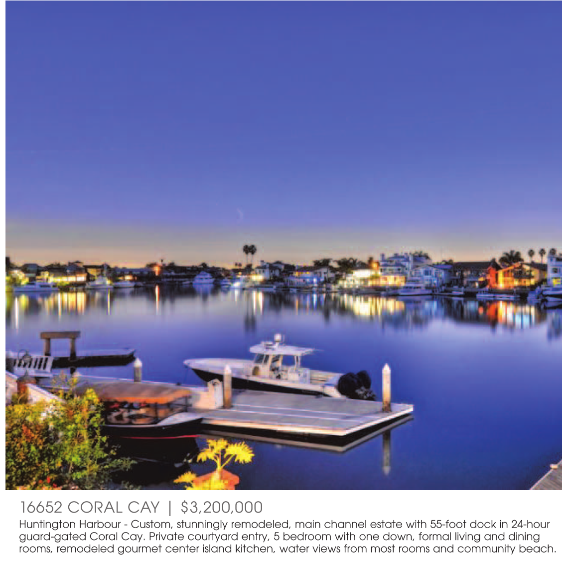 Huntington Harbour - Custom, stunningly remodeled, main channel estate with 55-foot dock in 24-hour guard-gated Coral Cay. Private courtyard entry, 5 bedroom with one down, formal living and dining rooms, remodeled gourmet center island kitchen, water views from most rooms and community beach.