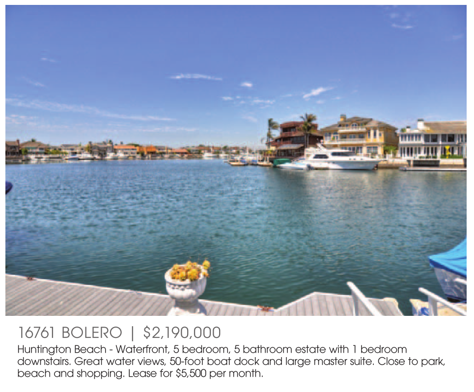 Huntington Beach - Waterfront, 5 bedroom, 5 bathroom estate with 1 bedroom downstairs. Great water views, 50-foot boat dock and large master suite. Close to park, beach and shopping. Lease for $5,500 per month.