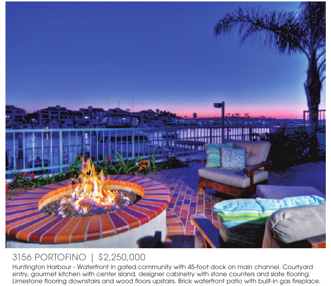 3156 PORTOFINO | $2,250,000 Huntington Harbour - Waterfront in gated community with 45-foot dock on main channel. Courtyard entry, gourmet kitchen with center island, designer cabinetry with stone counters and slate flooring. Limestone flooring downstairs and wood floors upstairs. Brick waterfront patio with built-in gas fireplace.