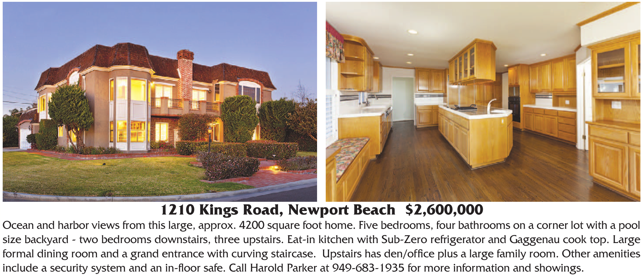 1210 Kings Road, Newport Beach $2,600,000 Ocean and harbor views from this large, approx. 4200 square foot home. Five bedrooms, four bathrooms on a corner lot with a pool size backyard - two bedrooms downstairs, three upstairs. Eat-in kitchen with Sub-Zero refrigerator and Gaggenau cook top. Large formal dining room and a grand entrance with curving staircase. Upstairs has den/office plus a large family room. Other amenities include a security system and an in-floor safe. Call Harold Parker at 949-683-1935 for more information and showings.