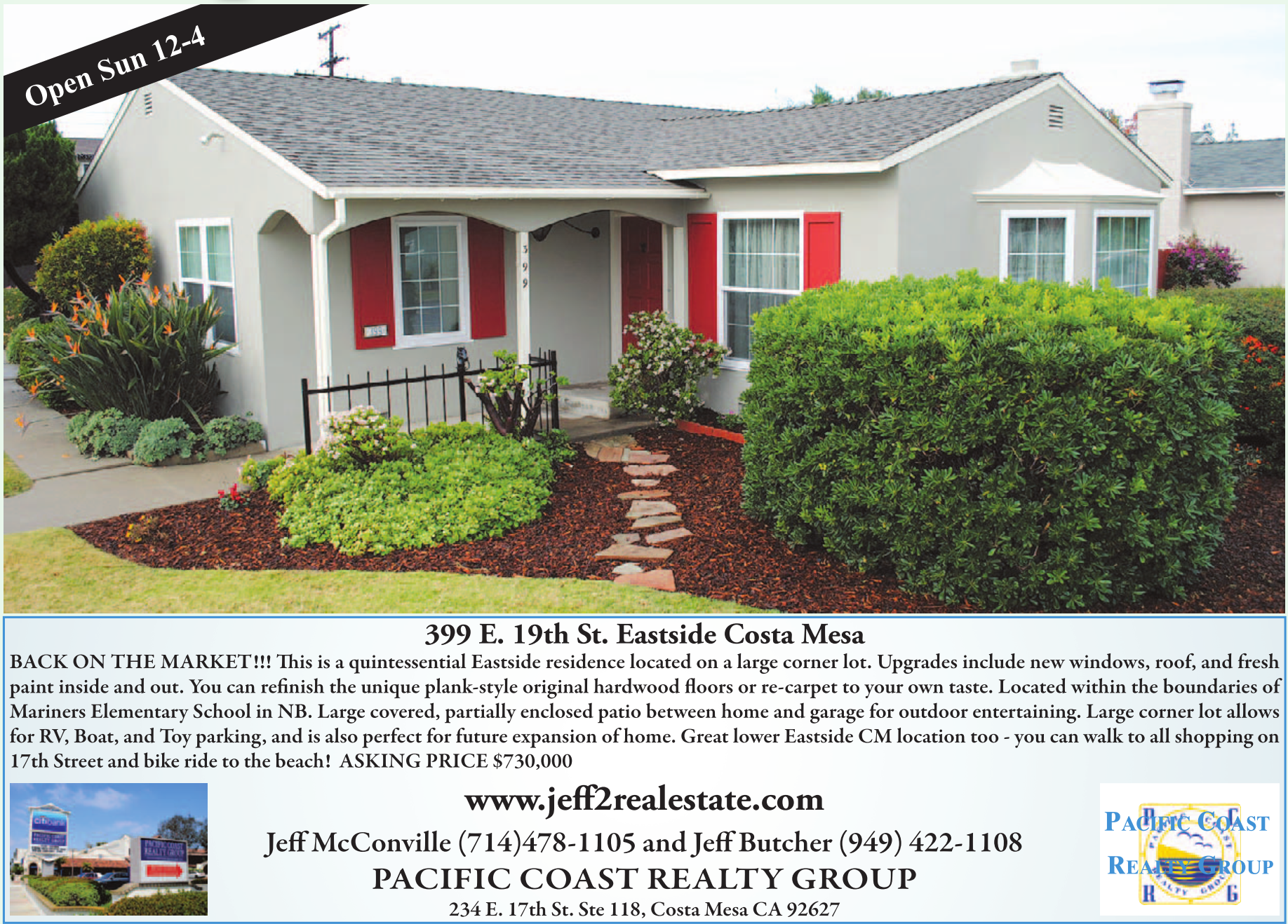 399 E. 19th St. Eastside Costa Mesa BACK ON THE MARKET!!! This is a quintessential Eastside residence located on a large corner lot. Upgrades include new windows, roof, and fresh paint inside and out. You can refinish the unique plank-style original hardwood floors or re-carpet to your own taste. Located within the boundaries of Mariners Elementary School in NB. Large covered, partially enclosed patio between home and garage for outdoor entertaining. Large corner lot allows for RV, Boat, and Toy parking, and is also perfect for future expansion of home. Great lower Eastside CM location too - you can walk to all shopping on 17th Street and bike ride to the beach! ASKING PRICE $730,000 www.jeff2realestate.com Jeff McConville (714)478-1105 and Jeff Butcher (949) 422-1108 PACIFIC COAST REALTY GROUP 234 E. 17th St. Ste 118, Costa Mesa CA 92627 PACIFIC COAST REALTY GROUP