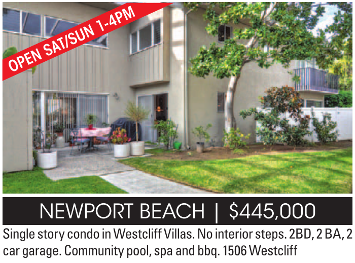 Single story condo in Westcliff Villas. No interior steps. 2BD, 2 BA, 2 car garage. Community pool, spa and bbq. 1506 Westcliff