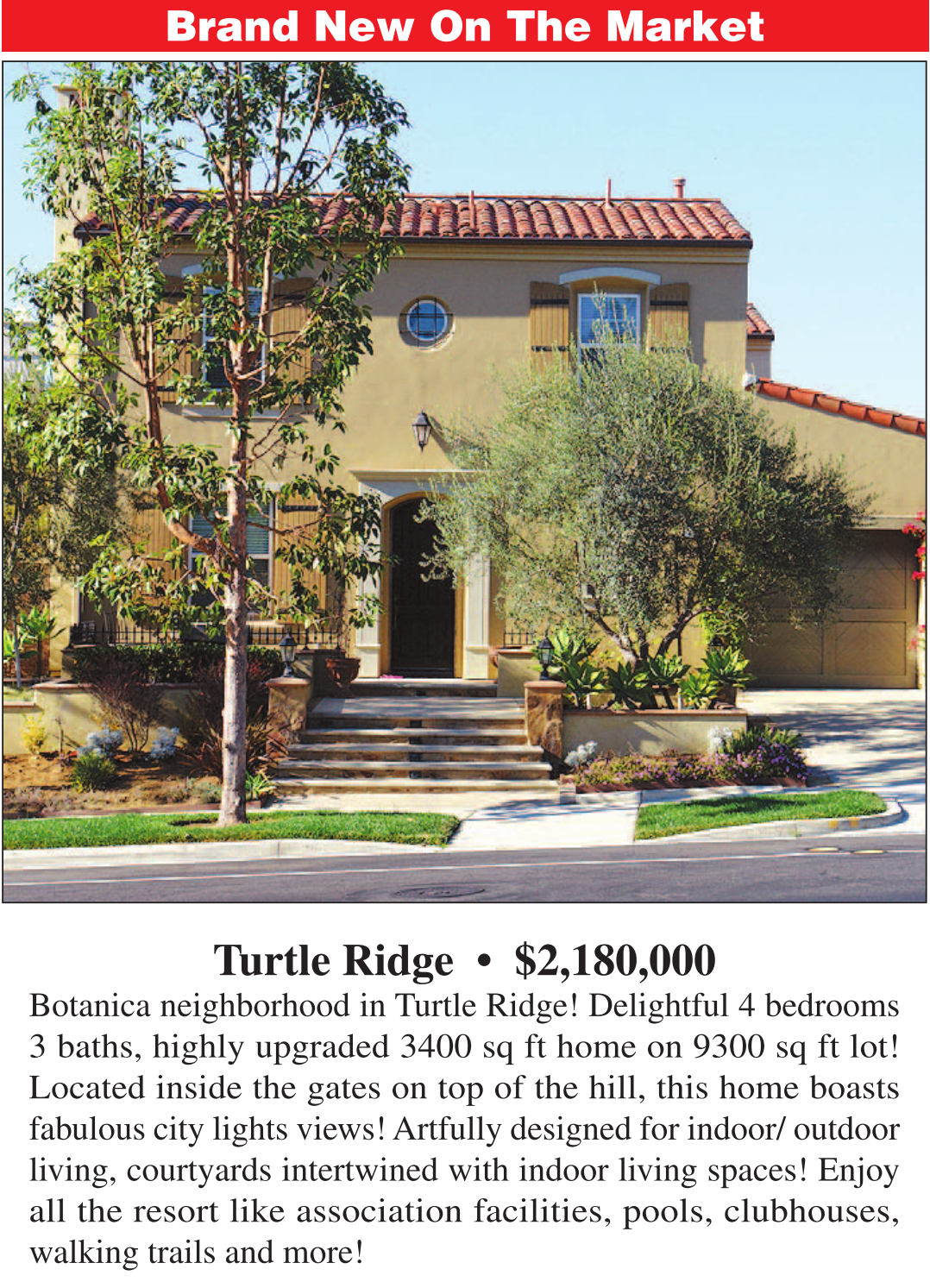Brand New On The Market Turtle Ridge • $2,180,000 Botanica neighborhood in Turtle Ridge! Delightful 4 bedrooms 3 baths, highly upgraded 3400 sq ft home on 9300 sq ft lot! Located inside the gates on top of the hill, this home boasts fabulous city lights views! Artfully designed for indoor/ outdoor living, courtyards intertwined with indoor living spaces! Enjoy all the resort like association facilities, pools, clubhouses, walking trails and more!