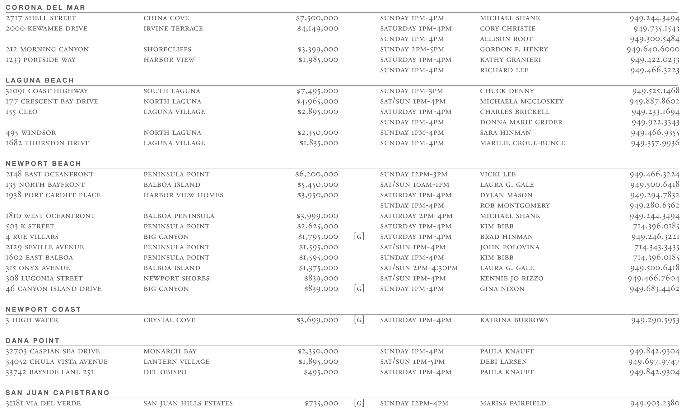 CORONA DEL MAR 2717 shell street china cove $7,500,000 sunday 1pm-4pm michael shank 949.244.3494 2000 kewamee drive irvine terrace $4,149,000 saturday 1pm-4pm cory christie 949.735.1543 sunday 1pm-4pm allison root 949.300.5484 212 morning canyon shorecliffs $3,399,000 sunday 2pm-5pm gordon f. henry 949.640.6000 1233 portside way harbor view $1,985,000 saturday 1pm-4pm kathy granieri 949.422.0233 sunday 1pm-4pm richard lee 949.466.3223 LAGUNA BEACH 31091 coast highway south laguna $7,495,000 sunday 1pm-3pm chuck denny 949.525.1468 177 crescent bay drive north laguna $4,965,000 sat/sun 1pm-4pm michaela mccloskey 949.887.8602 155 cleo laguna village $2,895,000 saturday 1pm-4pm charles brickell 949.233.1694 sunday 1pm-4pm donna marie grider 949.922.3343 495 windsor north laguna $2,350,000 sunday 1pm-4pm sara hinman 949.466.9355 1682 thurston drive laguna village $1,835,000 sunday 1pm-4pm marilie croul-bunce 949.357.9936