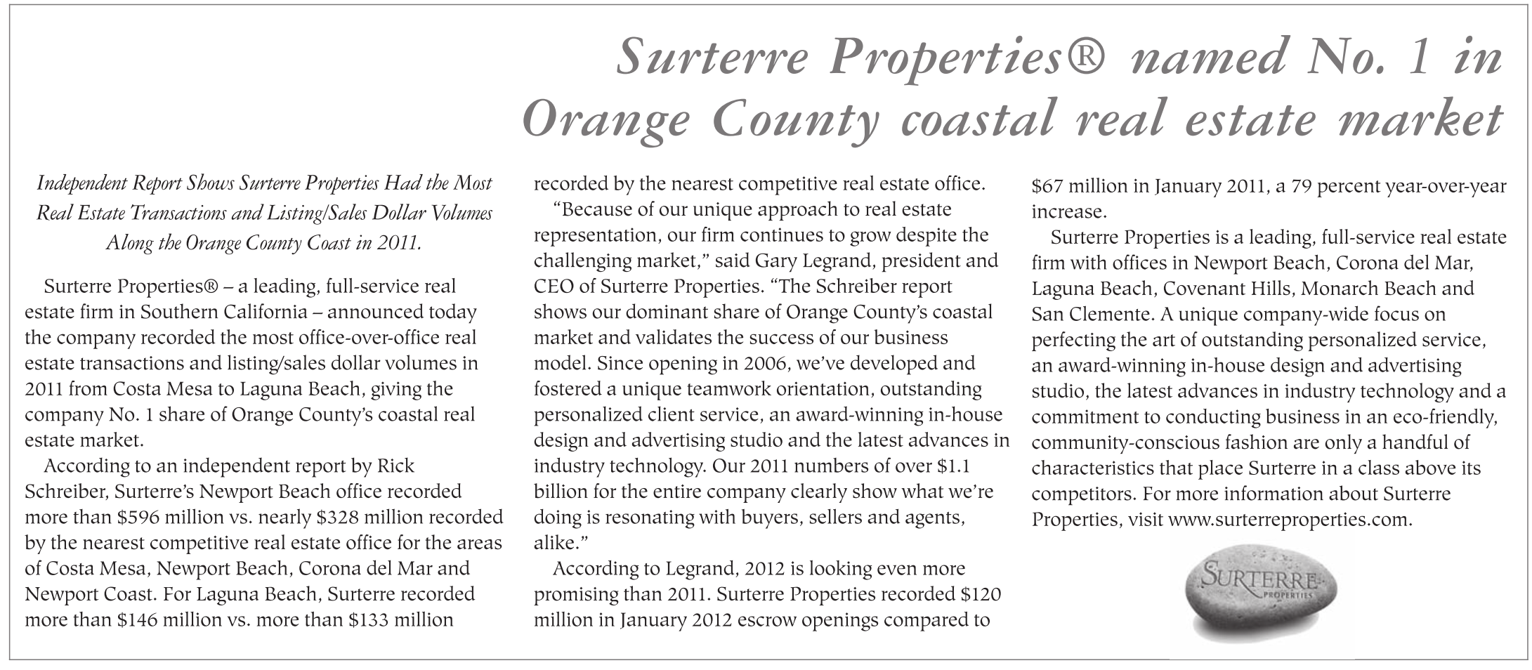 “Because of our unique approach to real estate representation, our firm continues to grow despite the challenging market,” said Gary Legrand, president and CEO of Surterre Properties. “The Schreiber report shows our dominant share of Orange County’s coastal market and validates the success of our business model. Since opening in 2006, we’ve developed and fostered a unique teamwork orientation, outstanding personalized client service, an award-winning in-house design and advertising studio and the latest advances in industry technology. Our 2011 numbers of over $1.1 billion for the entire company clearly show what we’re doing is resonating with buyers, sellers and agents, alike.”