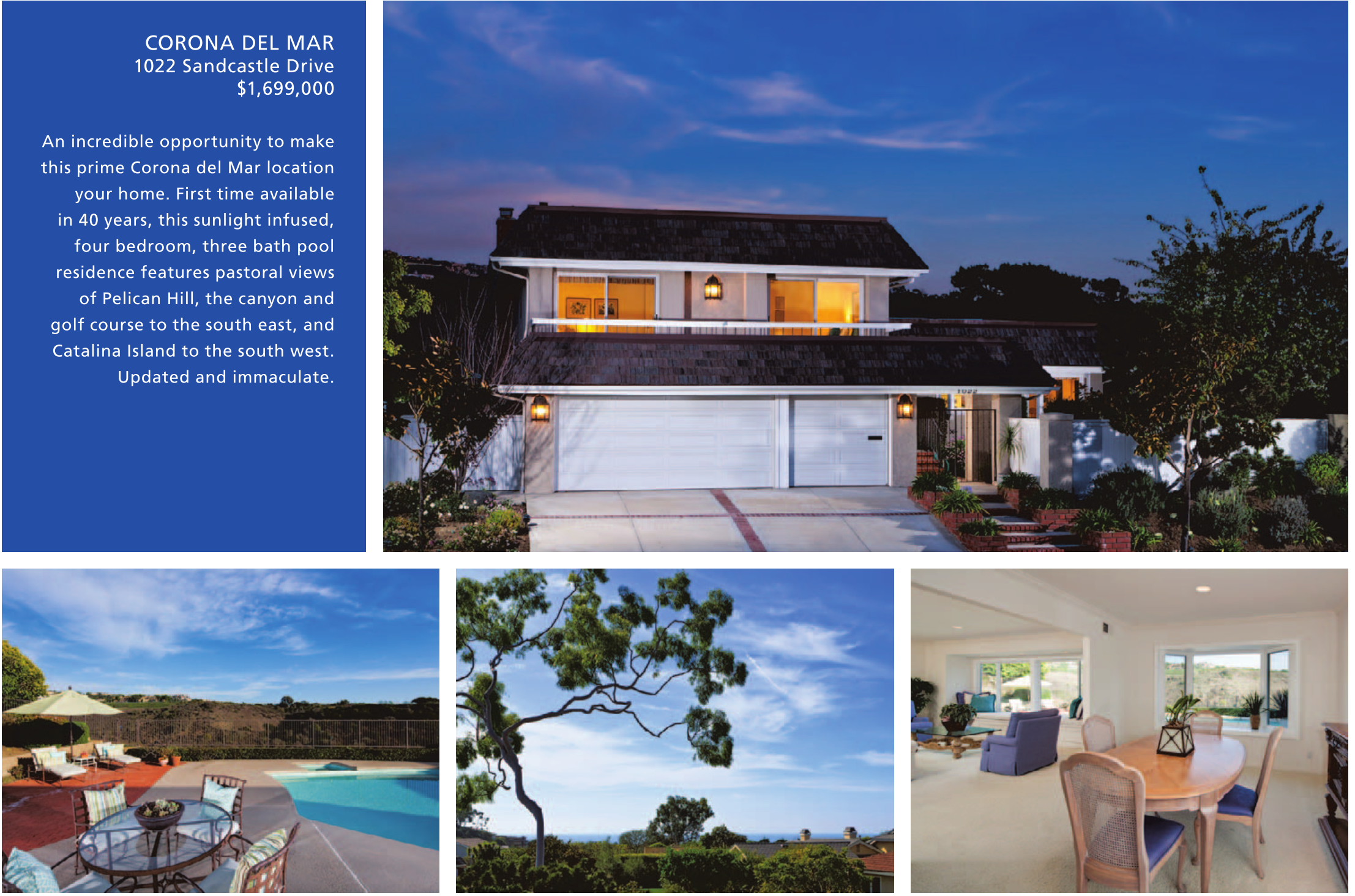 CORONA DEL MAR 1022 Sandcastle Drive $1,699,000 An incredible opportunity to make this prime Corona del Mar location your home. First time available in 40 years, this sunlight infused, four bedroom, three bath pool residence features pastoral views of Pelican Hill, the canyon and golf course to the south east, and Catalina Island to the south west. Updated and immaculate.