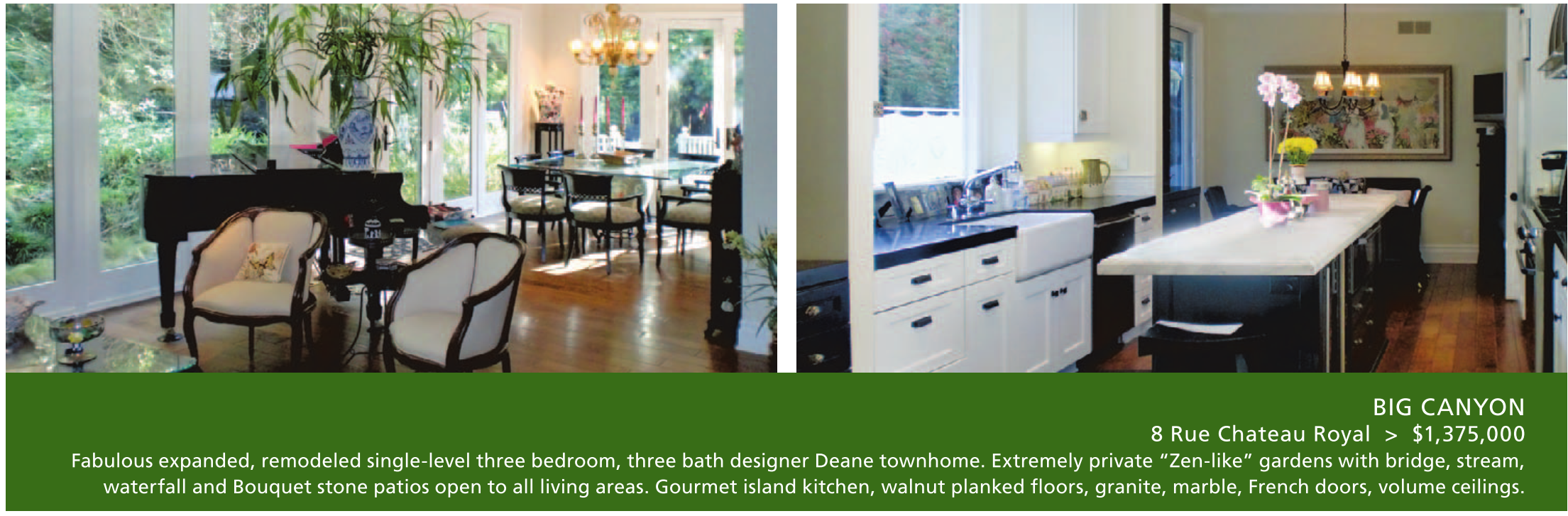 BIG CANYON 8 Rue Chateau Royal > $1,375,000 Fabulous expanded, remodeled single-level three bedroom, three bath designer Deane townhome. Extremely private “Zen-like” gardens with bridge, stream, waterfall and Bouquet stone patios open to all living areas. Gourmet island kitchen, walnut planked floors, granite, marble, French doors, volume ceilings.