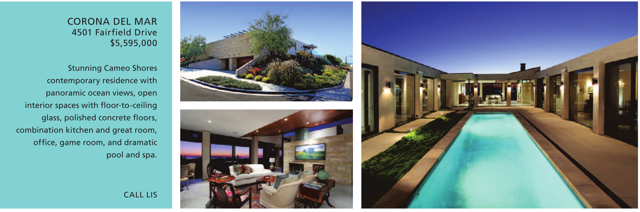 CORONA DEL MAR 4501 Fairfield Drive $5,595,000 Stunning Cameo Shores contemporary residence with panoramic ocean views, open interior spaces with floor-to-ceiling glass, polished concrete floors, combination kitchen and great room, office, game room, and dramatic pool and spa. CALL LIS