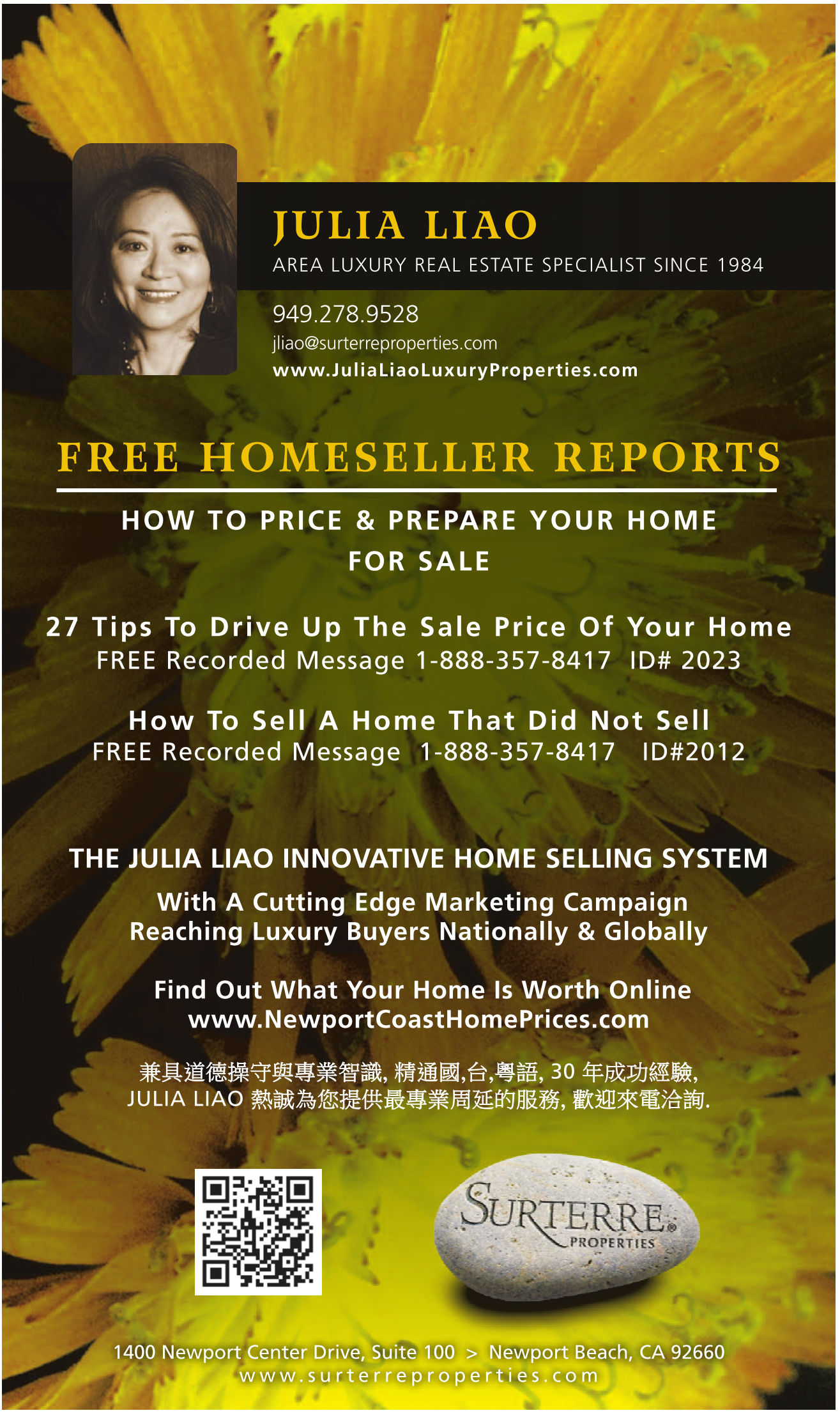 JULIA LIAO AREA LUXURY REAL ESTATE SPECIALIST SINCE 1984 949.278.9528 jliao@surterreproperties.com www.JuliaLiaoLuxuryProperties.com F R E E H O M E S E L L E R R E P O RT S HOW TO PRICE & PREPARE YOUR HOME FOR SALE 27 Tips To Drive Up The Sale Price Of Your Home FREE Recorded Message 1-888-357-8417 ID# 2023 How To Sell A Home That Did Not Sell FREE Recorded Message 1-888-357-8417 ID#2012 THE JULIA LIAO INNOVATIVE HOME SELLING SYSTEM With A Cutting Edge Marketing Campaign Reaching Luxury Buyers Nationally & Globally Find Out What Your Home Is Worth Online www.NewportCoastHomePrices.com , , , , 30 , JULIA LIAO , . 1400 Newport Center Drive, Suite 100 > Newport Beach, CA 92660 www.surterreproperties.com