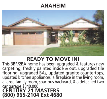 ANAHEIM READY TO MOVE IN! This 3BR/2BA home has been upgraded & features new carpeting, freshly painted inside & out, upgraded tile flooring, upgraded BAs, updated granite countertops, updated kitchen appliances, a fireplace in the living room, a large family room, spacious backyard, & a detached two car garage $340,000 CENTURY 21 MASTERS (800) 965-2104 Ext 4680 See also