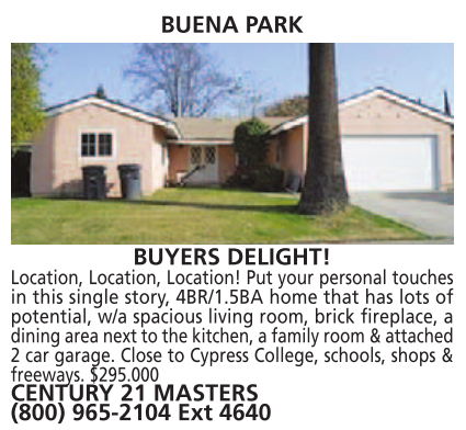 Location, Location, Location! Put your personal touches in this single story, 4BR/1.5BA home that has lots of potential, w/a spacious living room, brick fireplace, a dining area next to the kitchen, a family room & attached 2 car garage. Close to Cypress College, schools, shops & freeways. $295.000 CENTURY 21 MASTERS (800) 965-2104 Ext 4640