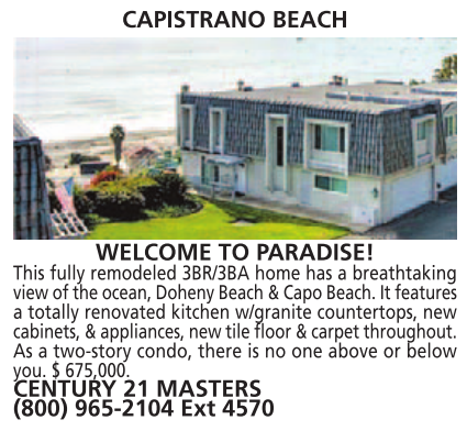 CAPISTRANO BEACH WELCOME TO PARADISE! This fully remodeled 3BR/3BA home has a breathtaking view of the ocean, Doheny Beach & Capo Beach. It features a totally renovated kitchen w/granite countertops, new cabinets, & appliances, new tile floor & carpet throughout. As a two-story condo, there is no one above or below you. $ 675,000. CENTURY 21 MASTERS (800) 965-2104 Ext 4570