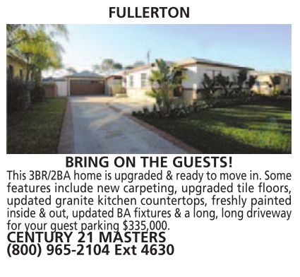 FULLERTON BRING ON THE GUESTS! This 3BR/2BA home is upgraded & ready to move in. Some features include new carpeting, upgraded tile floors, updated granite kitchen countertops, freshly painted inside & out, updated BA fixtures & a long, long driveway for your guest parking $335,000. CENTURY 21 MASTERS (800) 965-2104 Ext 4630 See also