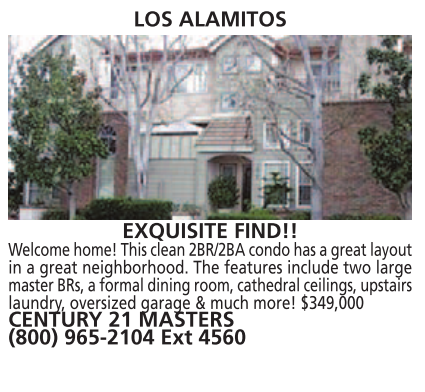 Welcome home! This clean 2BR/2BA condo has a great layout in a great neighborhood. The features include two large master BRs, a formal dining room, cathedral ceilings, upstairs laundry, oversized garage & much more! $349,000 CENTURY 21 MASTERS (800) 965-2104 Ext 4560