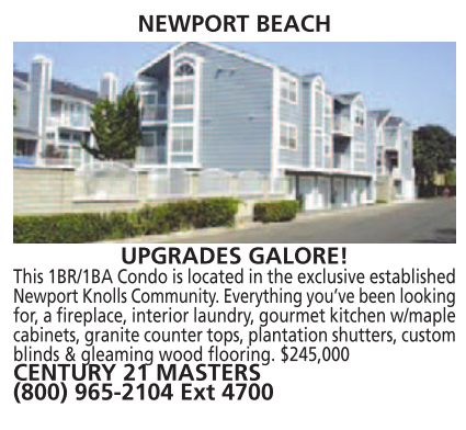 NEWPORT BEACH UPGRADES GALORE! This 1BR/1BA Condo is located in the exclusive established Newport Knolls Community. Everything you’ve been looking for, a fireplace, interior laundry, gourmet kitchen w/maple cabinets, granite counter tops, plantation shutters, custom blinds & gleaming wood flooring. $245,000 CENTURY 21 MASTERS (800) 965-2104 Ext 4700 See also