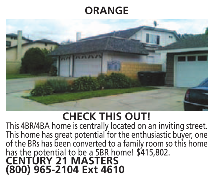 ORANGE CHECK THIS OUT! This 4BR/4BA home is centrally located on an inviting street. This home has great potential for the enthusiastic buyer, one of the BRs has been converted to a family room so this home has the potential to be a 5BR home! $415,802. CENTURY 21 MASTERS (800) 965-2104 Ext 4610 See also