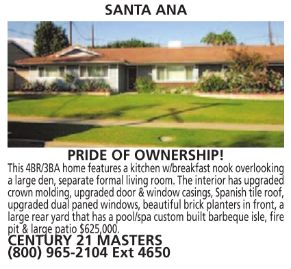 SANTA ANA PRIDE OF OWNERSHIP! This 4BR/3BA home features a kitchen w/breakfast nook overlooking a large den, separate formal living room. The interior has upgraded crown molding, upgraded door & window casings, Spanish tile roof, upgraded dual paned windows, beautiful brick planters in front, a large rear yard that has a pool/spa custom built barbeque isle, fire pit & large patio $625,000. CENTURY 21 MASTERS (800) 965-2104 Ext 4650