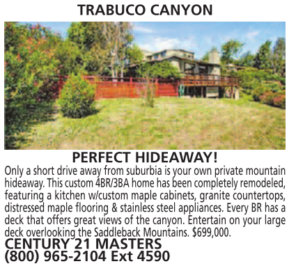 TRABUCO CANYON PERFECT HIDEAWAY! Only a short drive away from suburbia is your own private mountain hideaway. This custom 4BR/3BA home has been completely remodeled, featuring a kitchen w/custom maple cabinets, granite countertops, distressed maple flooring & stainless steel appliances. Every BR has a deck that offers great views of the canyon. Entertain on your large deck overlooking the Saddleback Mountains. $699,000. CENTURY 21 MASTERS (800) 965-2104 Ext 4590
