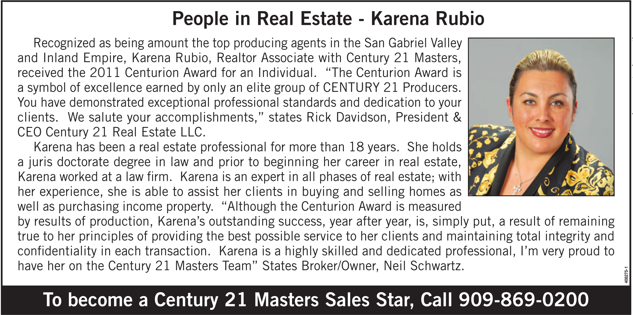 People in Real Estate - Karena Rubio Recognized as being amount the top producing agents in the San Gabriel Valley and Inland Empire, Karena Rubio, Realtor Associate with Century 21 Masters, received the 2011 Centurion Award for an Individual. “The Centurion Award is a symbol of excellence earned by only an elite group of CENTURY 21 Producers. You have demonstrated exceptional professional standards and dedication to your clients. We salute your accomplishments,” states Rick Davidson, President & CEO Century 21 Real Estate LLC. Karena has been a real estate professional for more than 18 years. She holds a juris doctorate degree in law and prior to beginning her career in real estate, Karena worked at a law firm. Karena is an expert in all phases of real estate; with her experience, she is able to assist her clients in buying and selling homes as well as purchasing income property. “Although the Centurion Award is measured by results of production, Karena’s outstanding success, year after year, is, simply put, a result of remaining true to her principles of providing the best possible service to her clients and maintaining total integrity and confidentiality in each transaction. Karena is a highly skilled and dedicated professional, I’m very proud to have her on the Century 21 Masters Team” States Broker/Owner, Neil Schwartz. To become a Century 21 Masters Sales Star, Call 909-869-0200