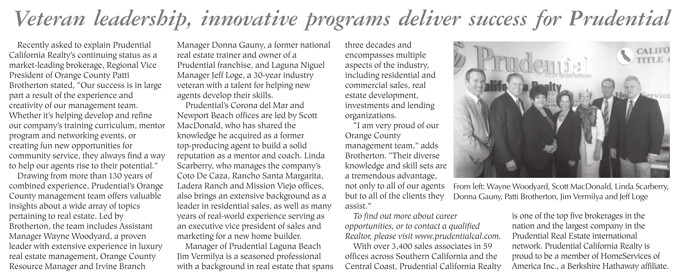 Prudential’s Corona del Mar and Newport Beach offices are led by Scott MacDonald, who has shared the knowledge he acquired as a former top-producing agent to build a solid reputation as a mentor and coach. Linda Scarberry, who manages the company’s Coto De Caza, Rancho Santa Margarita, Ladera Ranch and Mission Viejo offices, also brings an extensive background as a leader in residential sales, as well as many years of real-world experience serving as an executive vice president of sales and marketing for a new home builder.