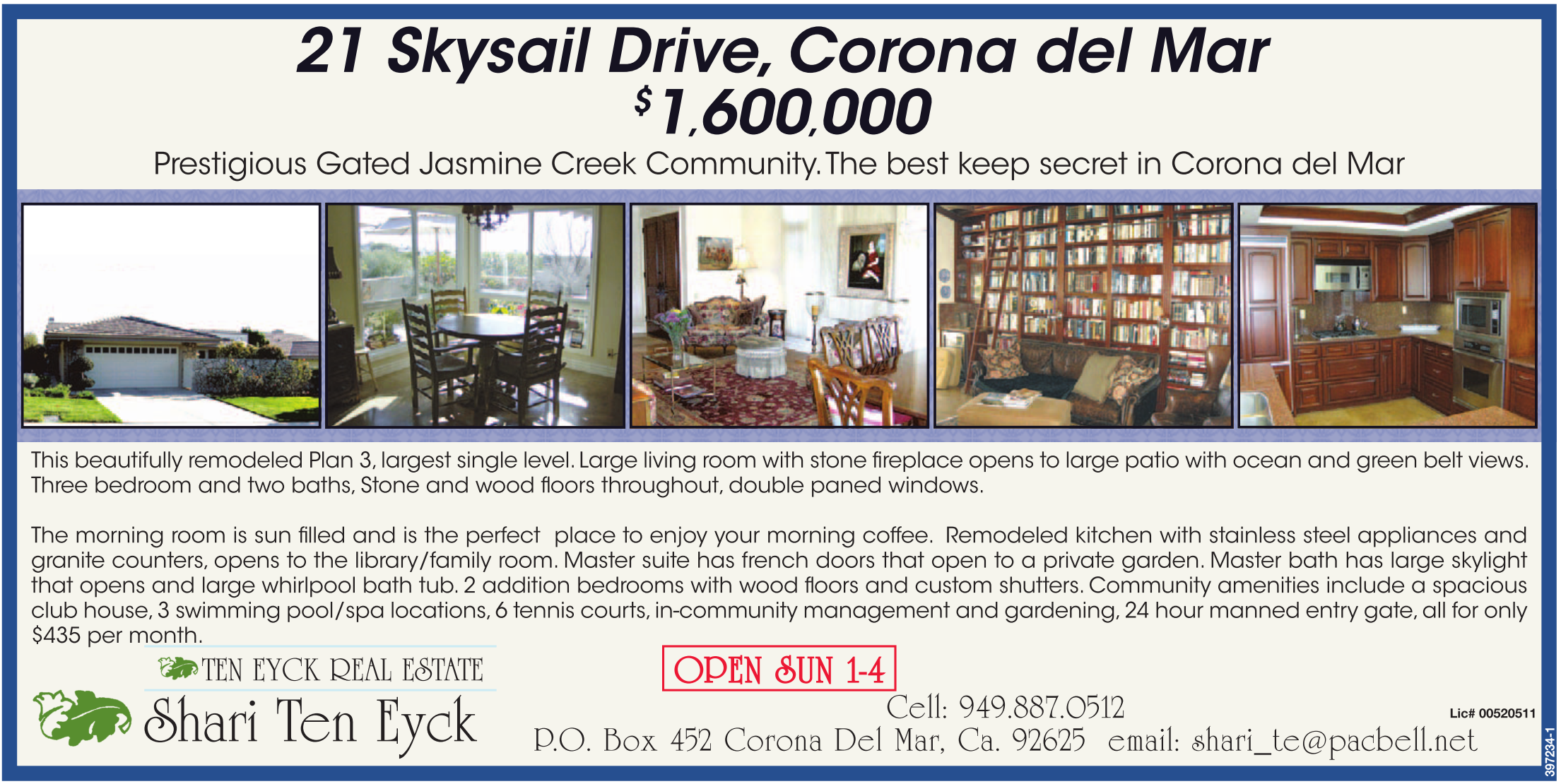 21 Skysail Drive, Corona del Mar $ 1,600,000 Prestigious Gated Jasmine Creek Community.The best keep secret in Corona del Mar This beautifully remodeled Plan 3, largest single level. Large living room with stone fireplace opens to large patio with ocean and green belt views. Three bedroom and two baths, Stone and wood floors throughout, double paned windows. The morning room is sun filled and is the perfect place to enjoy your morning coffee. Remodeled kitchen with stainless steel appliances and granite counters, opens to the library/family room. Master suite has french doors that open to a private garden. Master bath has large skylight that opens and large whirlpool bath tub. 2 addition bedrooms with wood floors and custom shutters. Community amenities include a spacious club house, 3 swimming pool/spa locations, 6 tennis courts, in-community management and gardening, 24 hour manned entry gate, all for only $435 per month. TEN EYCK REAL ESTATE Shari Ten Eyck OPEN SUN 1-4 Cell: 949.887.0512 P.O. Box 452 Corona Del Mar, Ca. 92625 email: shari_te@pacbell.net Lic# 00520511