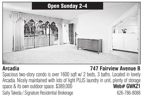 Open Sunday 2-4 Sally Takeda / Signature Residential Brokerage 626-786-8088 Arcadia 747 Fairview Avenue B Spacious two-story condo is over 1600 sqft w/ 2 beds, 3 baths. Located in lovely Arcadia. Nicely maintained with lots of light PLUS laundry in unit, plenty of storage space & its own outdoor space. $389,000 Web# GWKZ1