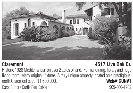 Claremont 4517 Live Oak Dr. Historic 1928 Mediterranean on over 2 acres of land. Formal dining, library and huge living room. Many original, fixtures. A truly unique property located on a prestigious, north Claremont street $1,600,000. Web# GUNV1 Carol Curtis / Curtis Real Estate 909-800-1982