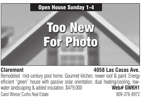 Open House Sunday 1-4 Claremont 4058 Las Casas Ave. Remodeled mid-century pool home. Gourmet kitchen, newer roof & paint. Energy efficient “green” house with passive solar orientation, dual heating/cooling, lowwater landscaping & added insulation. $479,000 Web# GWKH1 Carol Wiese/ Curtis Real Estate 909-376-8972
