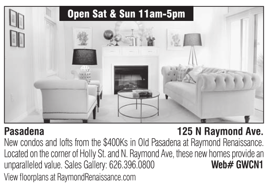 Open Sat & Sun 11am-5pm Pasadena 125 N Raymond Ave. New condos and lofts from the $400Ks in Old Pasadena at Raymond Renaissance. Located on the corner of Holly St. and N. Raymond Ave, these new homes provide an unparalleled value. Sales Gallery: 626.396.0800 Web# GWCN1 View floorplans at RaymondRenaissance.com