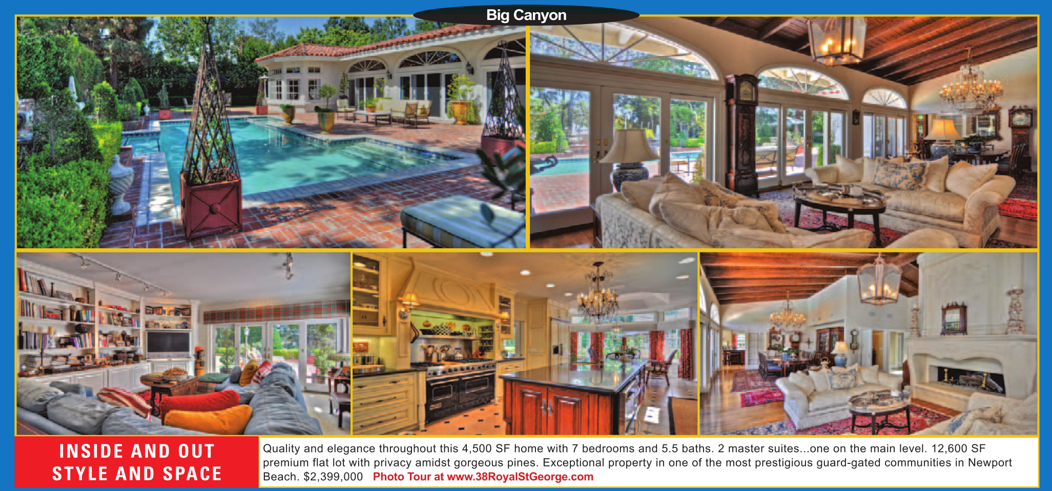 Big Canyon INSIDE AND OUT STYLE AND SPACE Quality and elegance throughout this 4,500 SF home with 7 bedrooms and 5.5 baths. 2 master suites...one on the main level. 12,600 SF premium flat lot with privacy amidst gorgeous pines. Exceptional property in one of the most prestigious guard-gated communities in Newport Beach. $2,399,000 Photo Tour at www.38RoyalStGeorge.com