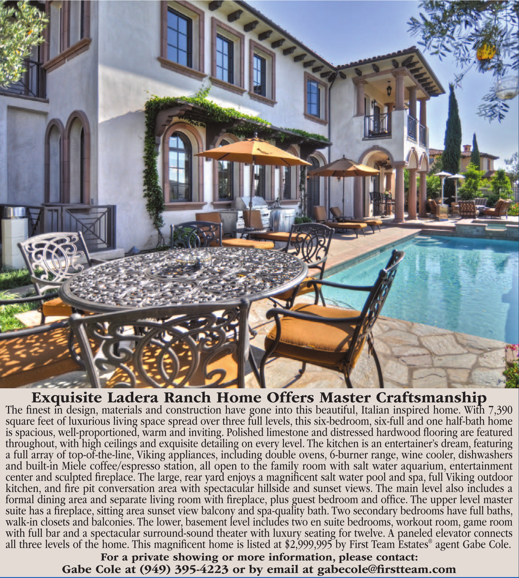 The finest in design, materials and construction have gone into this beautiful, Italian inspired home. With 7,390 square feet of luxurious living space spread over three full levels, this six-bedroom, six-full and one half-bath home is spacious, well-proportioned, warm and inviting. Polished limestone and distressed hardwood flooring are featured throughout, with high ceilings and exquisite detailing on every level. The kitchen is an entertainer’s dream, featuring a full array of top-of-the-line, Viking appliances, including double ovens, 6-burner range, wine cooler, dishwashers and built-in Miele coffee/espresso station, all open to the family room with salt water aquarium, entertainment center and sculpted fireplace. The large, rear yard enjoys a magnificent salt water pool and spa, full Viking outdoor kitchen, and fire pit conversation area with spectacular hillside and sunset views. The main level also includes a formal dining area and separate living room with fireplace, plus guest bedroom and office. The upper level master suite has a fireplace, sitting area sunset view balcony and spa-quality bath. Two secondary bedrooms have full baths, walk-in closets and balconies. The lower, basement level includes two en suite bedrooms, workout room, game room with full bar and a spectacular surround-sound theater with luxury seating for twelve. A paneled elevator connects all three levels of the home. This magnificent home is listed at $2,999,995 by First Team Estates