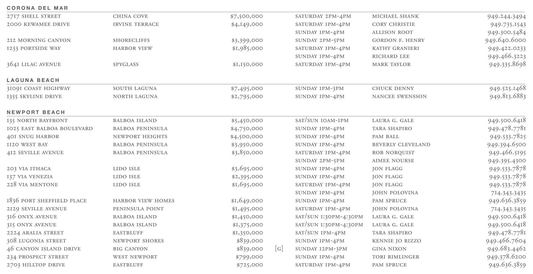 CORONA DEL MAR 2717 shell street china cove $7,500,000 saturday 2pm-4pm michael shank 949.244.3494 2000 kewamee drive irvine terrace $4,149,000 saturday 1pm-4pm cory christie 949.735.1543 sunday 1pm-4pm allison root 949.300.5484 212 morning canyon shorecliffs $3,399,000 sunday 2pm-5pm gordon f. henry 949.640.6000 1233 portside way harbor view $1,985,000 saturday 1pm-4pm kathy granieri 949.422.0233 sunday 1pm-4pm richard lee 949.466.3223 3641 lilac avenue spyglass $1,150,000 saturday 1pm-4pm mark taylor 949.335.8698