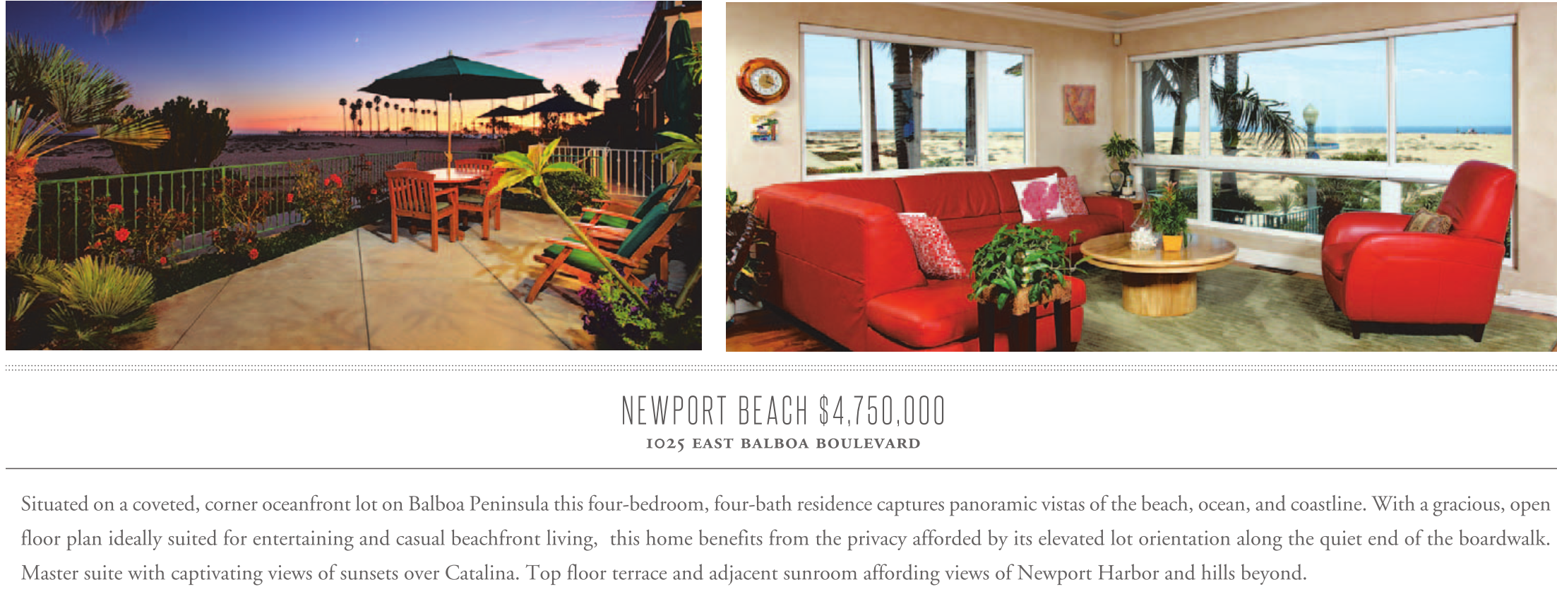 Situated on a coveted, corner oceanfront lot on Balboa Peninsula this four-bedroom, four-bath residence captures panoramic vistas of the beach, ocean, and coastline. With a gracious, open floor plan ideally suited for entertaining and casual beachfront living, this home benefits from the privacy afforded by its elevated lot orientation along the quiet end of the boardwalk. Master suite with captivating views of sunsets over Catalina. Top floor terrace and adjacent sunroom affording views of Newport Harbor and hills beyond.