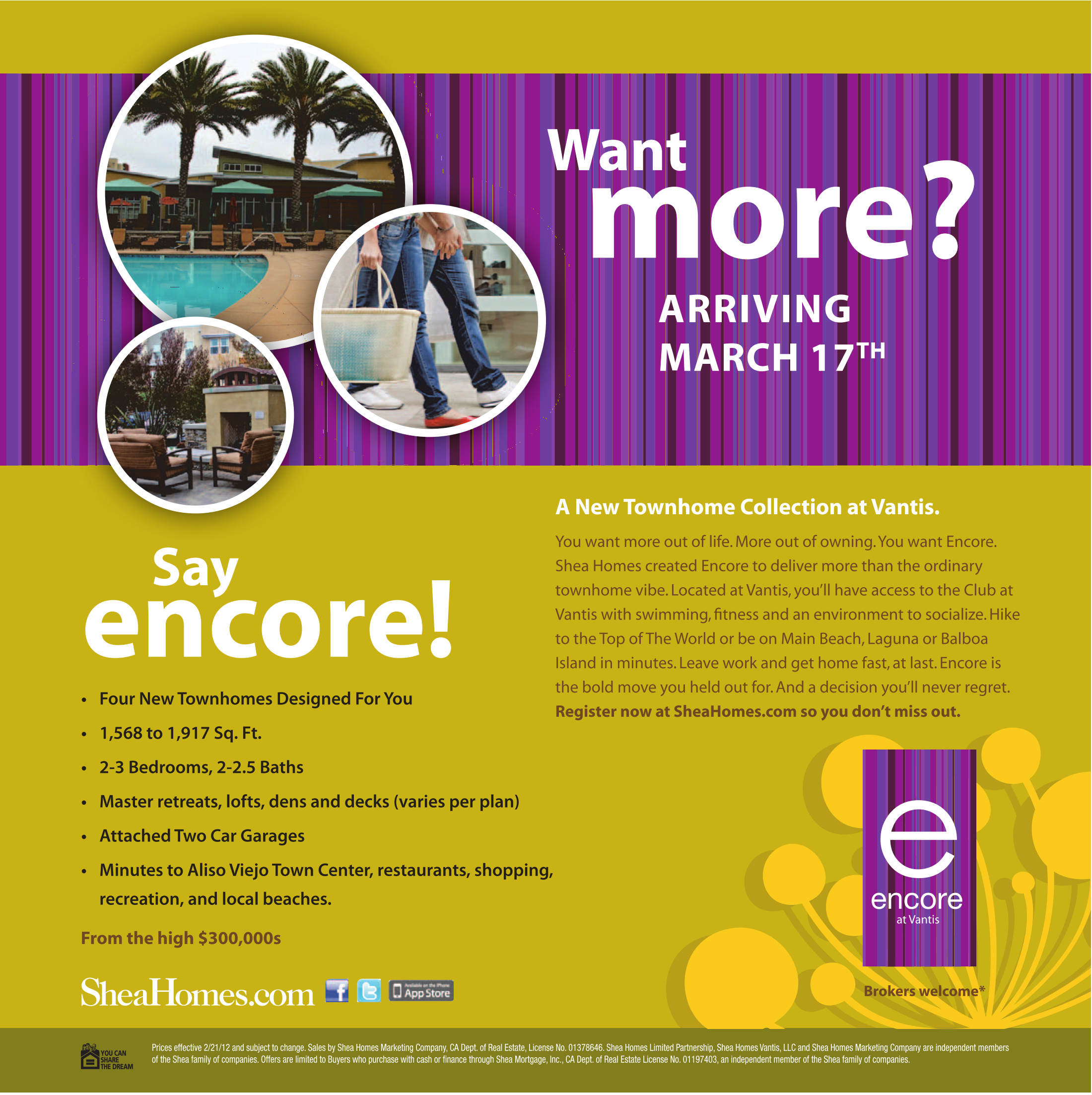 Prices effective 2/21/12 and subject to change. Sales by Shea Homes Marketing Company, CA Dept. of Real Estate, License No. 01378646. Shea Homes Limited Partnership, Shea Homes Vantis, LLC and Shea Homes Marketing Company are independent members of the Shea family of companies. Offers are limited to Buyers who purchase with cash or finance through Shea Mortgage, Inc., CA Dept. of Real Estate License No. 01197403, an independent member of the Shea family of companies.