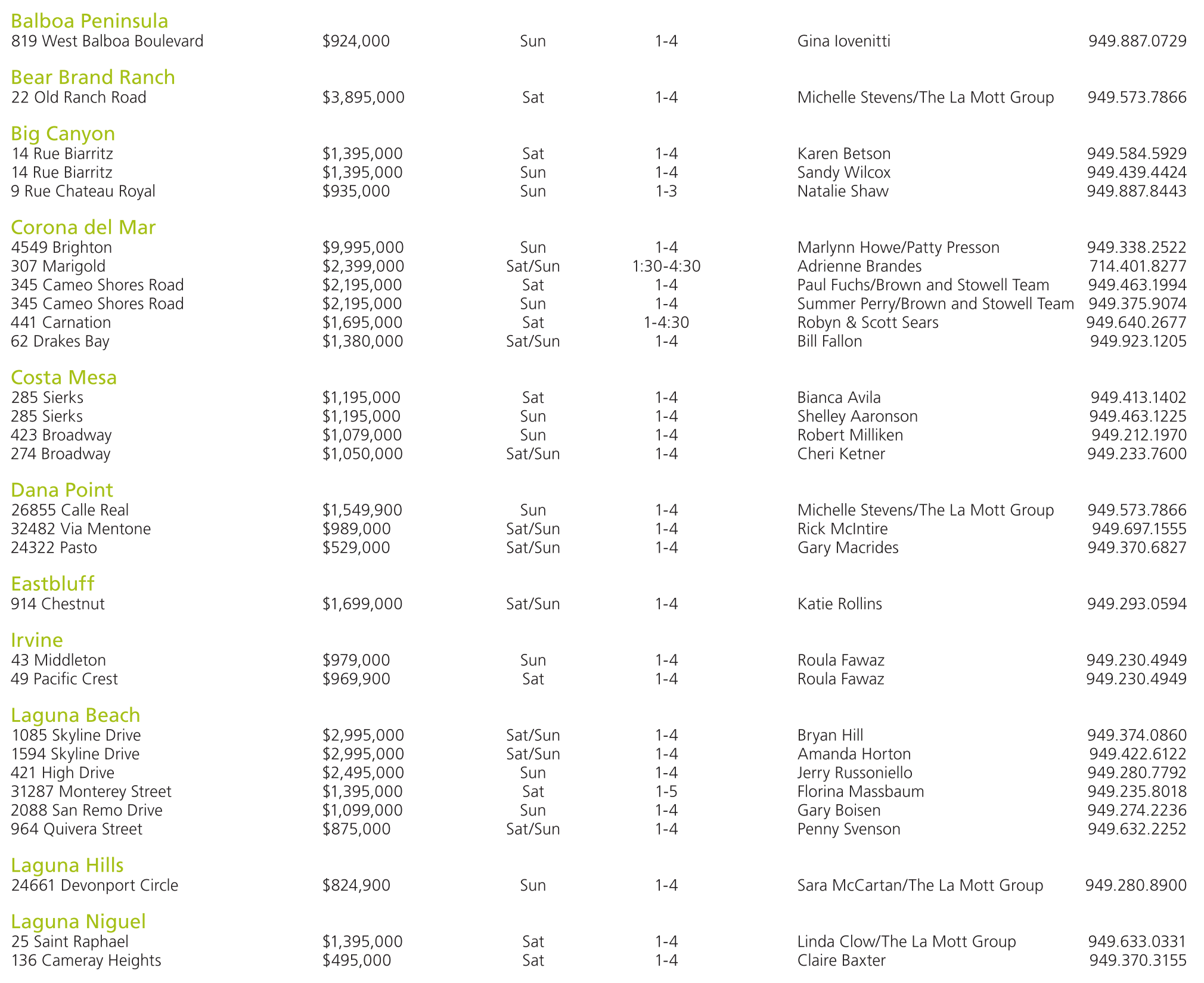 Balboa Peninsula 819 West Balboa Boulevard $924,000 Sun 1-4 Gina Iovenitti 949.887.0729 Bear Brand Ranch 22 Old Ranch Road $3,895,000 Sat 1-4 Michelle Stevens/The La Mott Group 949.573.7866 Big Canyon 14 Rue Biarritz $1,395,000 Sat 1-4 Karen Betson 949.584.5929 14 Rue Biarritz $1,395,000 Sun 1-4 Sandy Wilcox 949.439.4424 9 Rue Chateau Royal $935,000 Sun 1-3 Natalie Shaw 949.887.8443 Corona del Mar 4549 Brighton $9,995,000 Sun 1-4 Marlynn Howe/Patty Presson 949.338.2522 307 Marigold $2,399,000 Sat/Sun 1:30-4:30 Adrienne Brandes 714.401.8277 345 Cameo Shores Road $2,195,000 Sat 1-4 Paul Fuchs/Brown and Stowell Team 949.463.1994 345 Cameo Shores Road $2,195,000 Sun 1-4 Summer Perry/Brown and Stowell Team 949.375.9074 441 Carnation $1,695,000 Sat 1-4:30 Robyn & Scott Sears 949.640.2677 62 Drakes Bay $1,380,000 Sat/Sun 1-4 Bill Fallon 949.923.1205 Costa Mesa 285 Sierks $1,195,000 Sat 1-4 Bianca Avila 949.413.1402 285 Sierks $1,195,000 Sun 1-4 Shelley Aaronson 949.463.1225 423 Broadway $1,079,000 Sun 1-4 Robert Milliken 949.212.1970 274 Broadway $1,050,000 Sat/Sun 1-4 Cheri Ketner 949.233.7600 Dana Point 26855 Calle Real $1,549,900 Sun 1-4 Michelle Stevens/The La Mott Group 949.573.7866 32482 Via Mentone $989,000 Sat/Sun 1-4 Rick McIntire 949.697.1555 24322 Pasto $529,000 Sat/Sun 1-4 Gary Macrides 949.370.6827 Eastbluff 914 Chestnut $1,699,000 Sat/Sun 1-4 Katie Rollins 949.293.0594 Irvine 43 Middleton $979,000 Sun 1-4 Roula Fawaz 949.230.4949 49 Pacific Crest $969,900 Sat 1-4 Roula Fawaz 949.230.4949 Laguna Beach 1085 Skyline Drive $2,995,000 Sat/Sun 1-4 Bryan Hill 949.374.0860 1594 Skyline Drive $2,995,000 Sat/Sun 1-4 Amanda Horton 949.422.6122 421 High Drive $2,495,000 Sun 1-4 Jerry Russoniello 949.280.7792 31287 Monterey Street $1,395,000 Sat 1-5 Florina Massbaum 949.235.8018 2088 San Remo Drive $1,099,000 Sun 1-4 Gary Boisen 949.274.2236 964 Quivera Street $875,000 Sat/Sun 1-4 Penny Svenson 949.632.2252 Laguna Hills 24661 Devonport Circle $824,900 Sun 1-4 Sara McCartan/The La Mott Group 949.280.8900 Laguna Niguel 25 Saint Raphael $1,395,000 Sat 1-4 Linda Clow/The La Mott Group 949.633.0331 136 Cameray Heights $495,000 Sat 1-4 Claire Baxter 949.370.3155