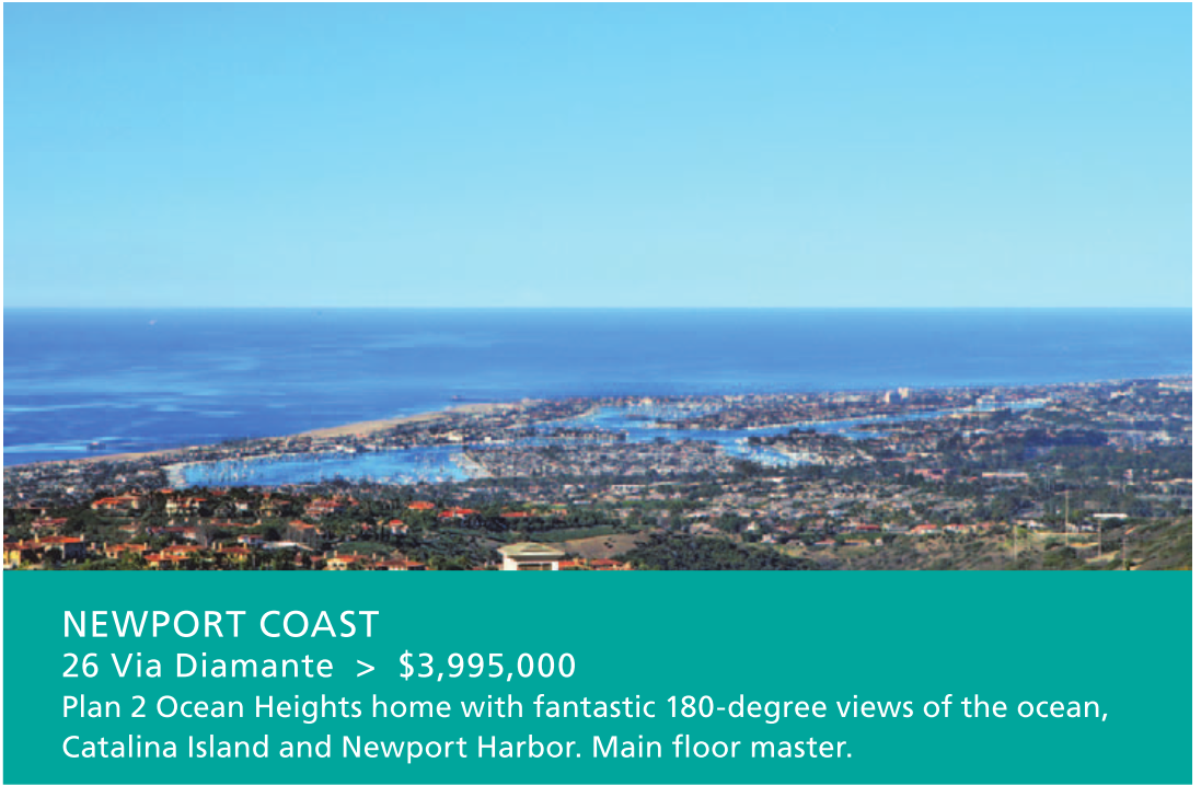 NEWPORT COAST 26 Via Diamante > $3,995,000 Plan 2 Ocean Heights home with fantastic 180-degree views of the ocean, Catalina Island and Newport Harbor. Main floor master.