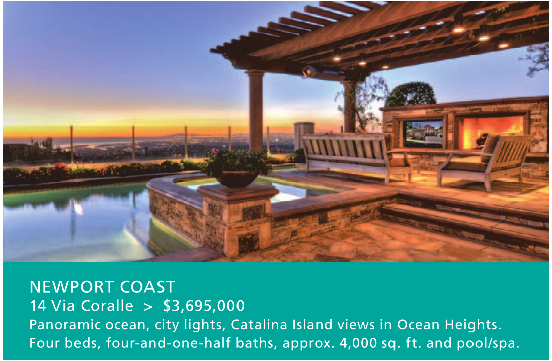 NEWPORT COAST 14 Via Coralle > $3,695,000 Panoramic ocean, city lights, Catalina Island views in Ocean Heights. Four beds, four-and-one-half baths, approx. 4,000 sq. ft. and pool/spa.