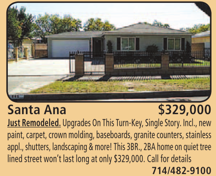 paint, carpet, crown molding, baseboards, granite counters, stainless appl., shutters, landscaping & more! This 3BR., 2BA home on quiet tree lined street won’t last long at only $329,000. Call for details 714/482-9100