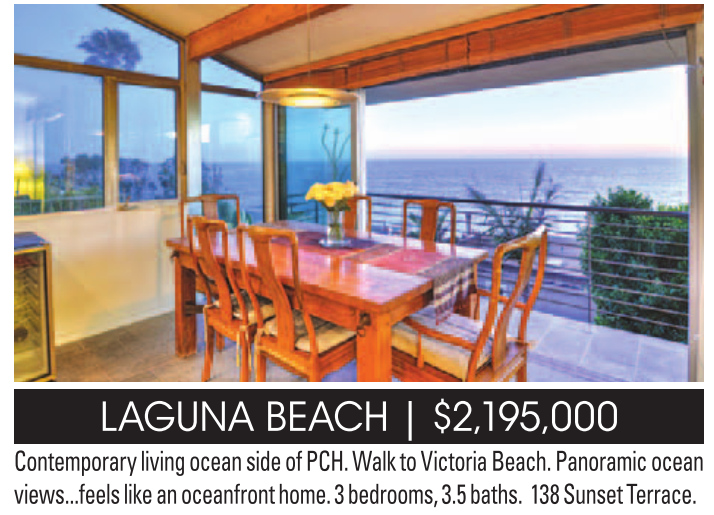 Contemporary living ocean side of PCH. Walk to Victoria Beach. Panoramic ocean views...feels like an oceanfront home. 3 bedrooms, 3.5 baths. 138 Sunset Terrace.