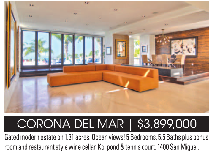 Gated modern estate on 1.31 acres. Ocean views! 5 Bedrooms, 5.5 Baths plus bonus room and restaurant style wine cellar. Koi pond & tennis court. 1400 San Miguel.