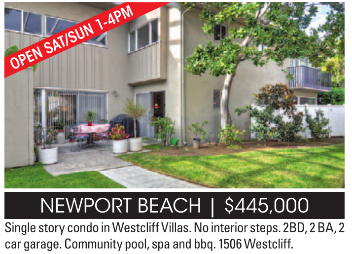 Single story condo in Westcliff Villas. No interior steps. 2BD, 2 BA, 2 car garage. Community pool, spa and bbq. 1506 Westcliff.