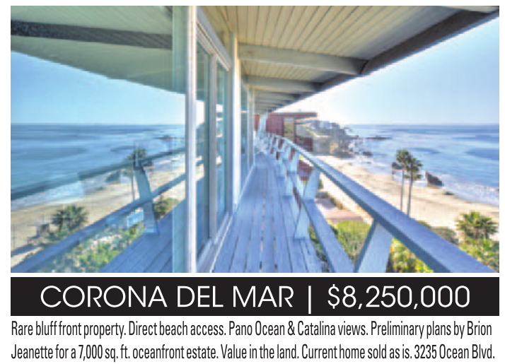 Rare bluff front property. Direct beach access. Pano Ocean & Catalina views. Preliminary plans by Brion Jeanette for a 7,000 sq. ft. oceanfront estate. Value in the land. Current home sold as is. 3235 Ocean Blvd.