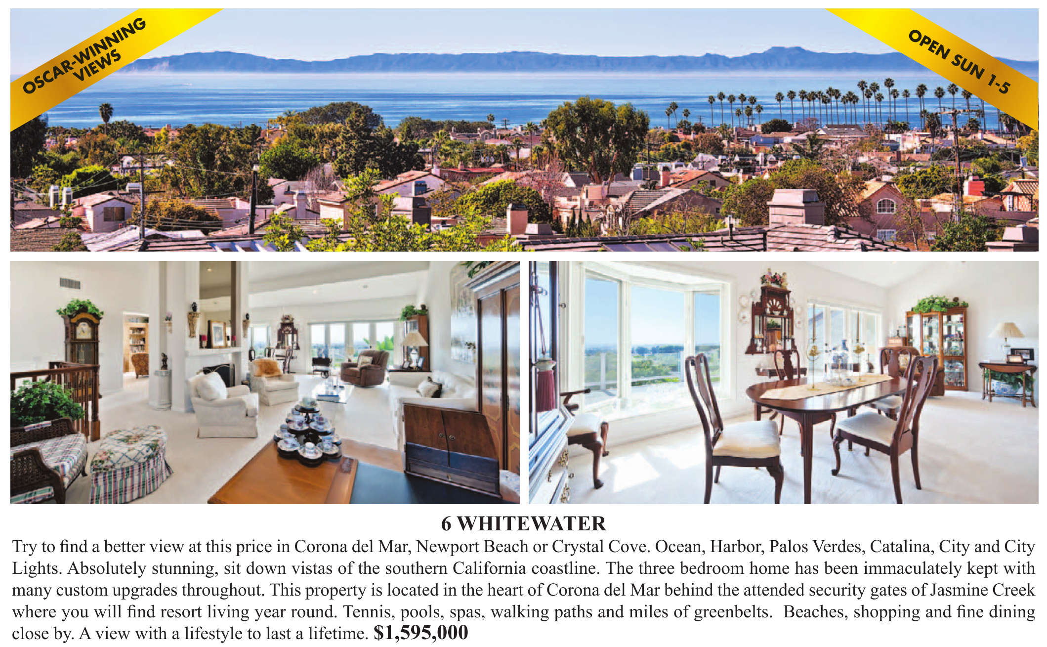 Try to find a better view at this price in Corona del Mar, Newport Beach or Crystal Cove. Ocean, Harbor, Palos Verdes, Catalina, City and City Lights. Absolutely stunning, sit down vistas of the southern California coastline. The three bedroom home has been immaculately kept with many custom upgrades throughout. This property is located in the heart of Corona del Mar behind the attended security gates of Jasmine Creek where you will find resort living year round. Tennis, pools, spas, walking paths and miles of greenbelts. Beaches, shopping and fine dining close by. A view with a lifestyle to last a lifetime.